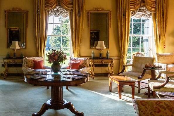 It has exceptionally tall ceilings and luxuriously draped sash windows, many with soft cushioned seats and fabulous views of the grounds.