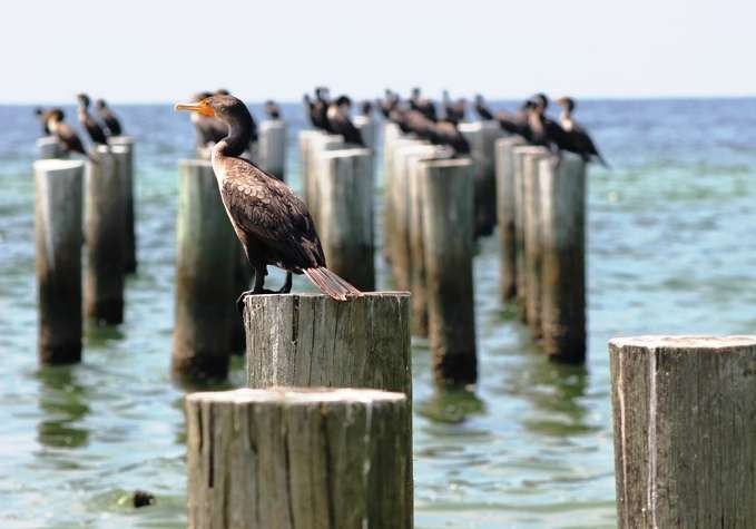 Head in the other direction, along the beach and the wooden struts of a one time smaller jetty provide resting places for more pelicans, cormorants and egrets.