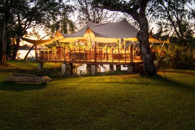 Architecturally designed partially on stilts in the river, it is a Bedouin-style tent, with lush furnishings inside.