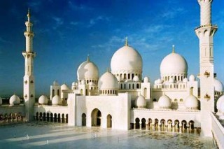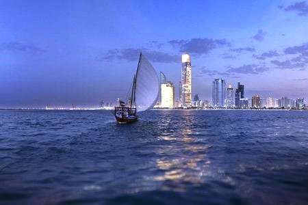 Abu Dhabi is the capital city of the United Arab Emirates and lies on a T-shaped island jutting into the Persian Gulf.
