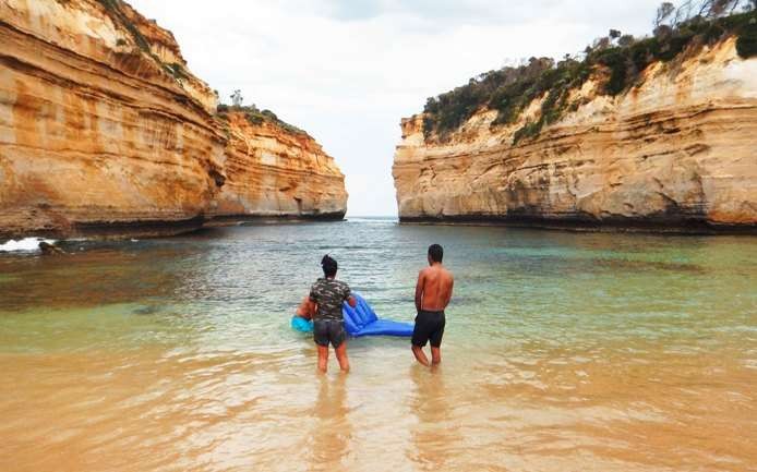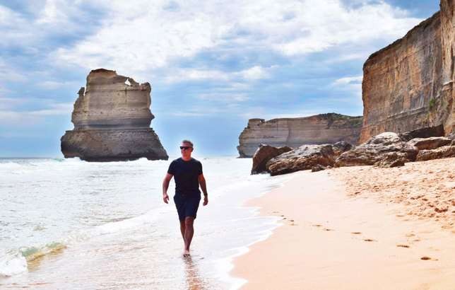 My son, Alex, and I plunge is framed by the Twelve Apostles, the magnificent limestone stacks towering 70 metres above the Pacific, 250 kilometres outside of Melbourne, Australia.