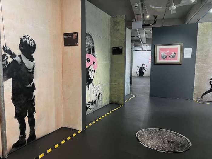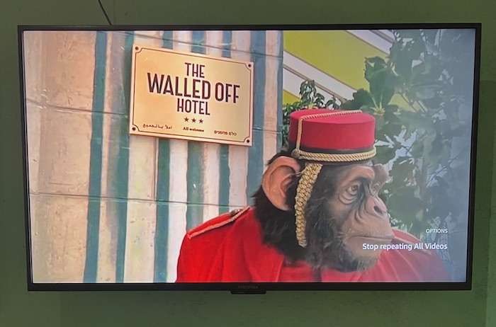 You may have seen Banksy work in situ before. You may have seen collections of Banksy or even visited his Walled Off Hotel in Paris.Here though, in the New York Banksy Museum you see a retrospective of sorts.The graffiti murals that are Banksy's stock in trade are displayed in such a way that none compete with the others. You feel like you are walking a maze of alleys all with the Banksy imprimatur.We saturate in Banksy irreverence.We linger with the detailing in the re-created Walled Off Hotel guest room—- thinking of the heavy US bombs now being deployed in Gaza and paid for with US tax dollars.