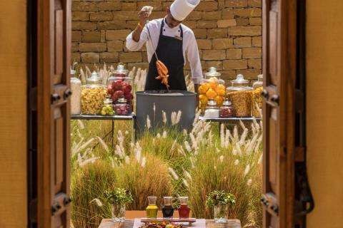 The fort-style resort is Suryagarh, a gateway to the Thar Desert, also known as the Great Indian Desert, and an arid region in the north-western part of the Indian subcontinent in India and Pakistan.