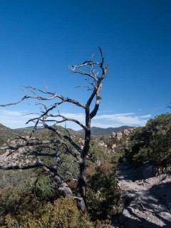 I asked him what was good on the menu. "Beer," he said, as his gap-toothed smile broadened. Wanting something a little more substantial than brewed barley, I pointed to the faded picture of a steak on the yellowed menu when the waitress came by. I included a bottle of cheap beer and winked over at Doug. He grinned and held his bottle up. Greasy french-fries rounded things out. The fluorescent lighting turned everything gray. It didn't matter much since the grizzled beef, which I struggled to hack through with a butter knife, would have been gray in any lighting. Across the six feet of worn linoleum that separated us, friendly banter with Doug drifted to more serious talk about my travels. I told him I'd be going through the Coronado National Forest on my way back to Tucson.
