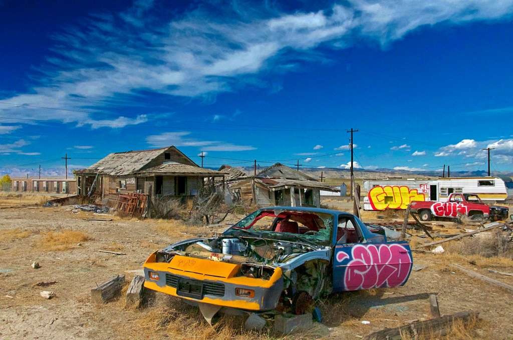 'Keep Out' signs and one particularly threatening 'Never Mind The Dog - Beware The Owner' warning, complete with revolver aimed between your eyes, suggest this junk ridden, derelict old town of broken down dwellings and ramshackle sheds still retains a sense of menace amidst its lonely graveyard in the desolate Utah landscape.