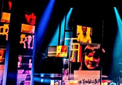 The staging, dominated by transient images of the social media age, sets the scene to a 'T'.