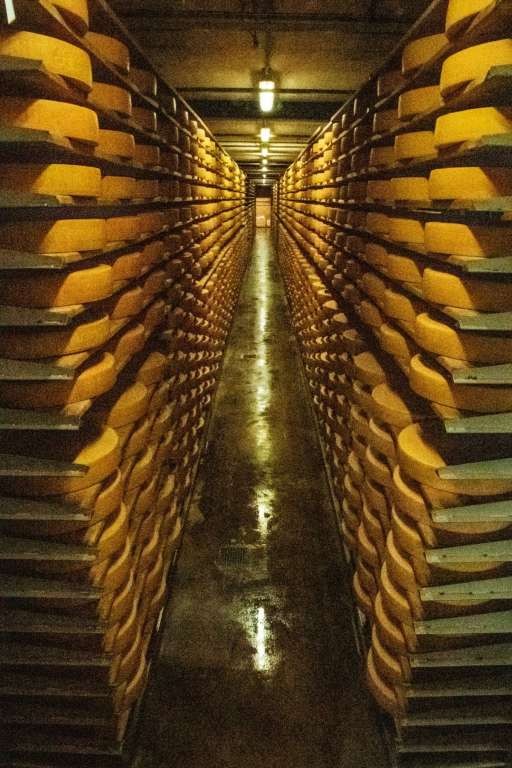 But back down to Gruyère-ville, La Maison du Gruyère is an amazing demonstration cheese dairy. It's a bright fresh welcoming building and immediately you can look through a glass windowed wall down at the cheese maturing cellars to where up to 7,000 wheels of Gruyère AOP cheeses are stored. This cheese has been made using a traditional recipe since 1115AD with the skills and techniques passed down from generation to generation. The initials AOP stand for Appellation d'origine protegee – the official guarantee of origin.