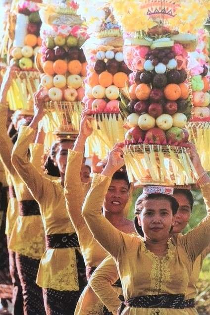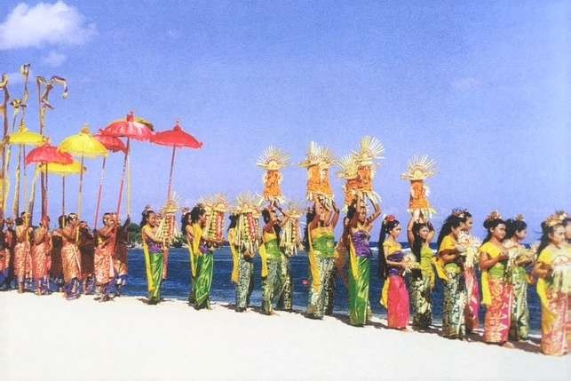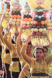 Ogoh Ogoh Parade is to purify the environment of spiritual pollutants and symbolize a mythological being of evil spirit The Hindu religion has instilled Balinese with a belief to attain harmonious balance between good and evil as shown in series of religious rites and festivals which guided them from Birth to Death. Visitors can witness the endless cycle Hindu ceremonies in island but their attires must be in scarf and sarong while in temple and observe etiquette. On the full moon night is an auspicious occasion and ceremony, worshippers go all the ways for praying and offering by balancing towers of fruits and sweet cakes on their heads for the joyous occasion which is also a platform provided for gathering of friends and family filled with gamelan music, dance.
