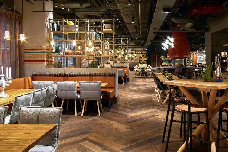 The hotel's Campfire Restaurant features a welcoming open fireplace as its focal point where residents can gather to enjoy comfort food from around the world.