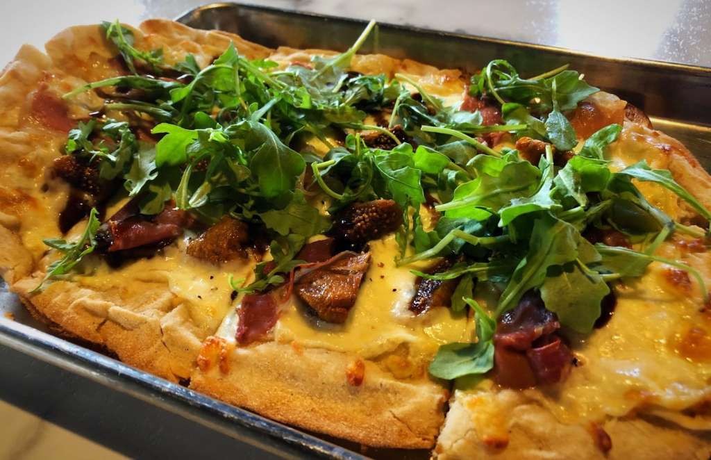 Wood oven fired pinsa crust (pizza crust) with dried mission figs, prosciutto, a blend of Romano, Parmesan, Mozzarella and Provolone cheeses topped with fresh arugula, black pepper and a balsamic glaze.