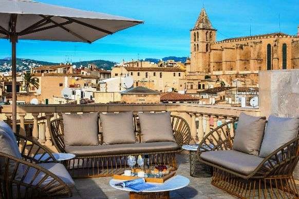 The hotel has a terrace overlooking Palma Cathedral, the sea and the old town and features private "hamacas" and a pool.