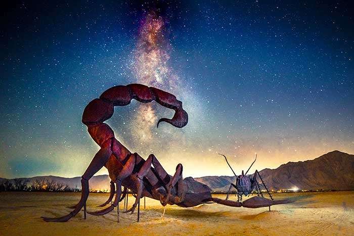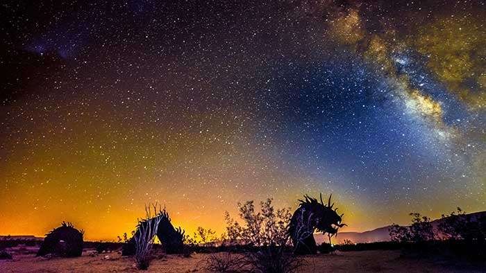 Arriving in Borrego Springs in the daytime is essential. I have to scout the sculptures. There are over 130 statues to choose from, as this prolific artist is given free rein to populate Galleta Meadows with his welded statuary.