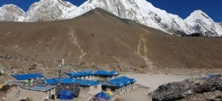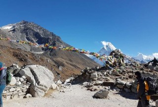 Sitting at the end of the terminal moraine of the Khumbu Glacier on the main route to Everest lies a bridge and a teahouse at a place called Dugla. Moving from there in the direction of Everest, a steep rocky ascent is encountered which rises over 300m and at the top of which sits the prayer flags and monuments of the Chukpo Lari. Here, the climbers who have died on Everest are remembered.