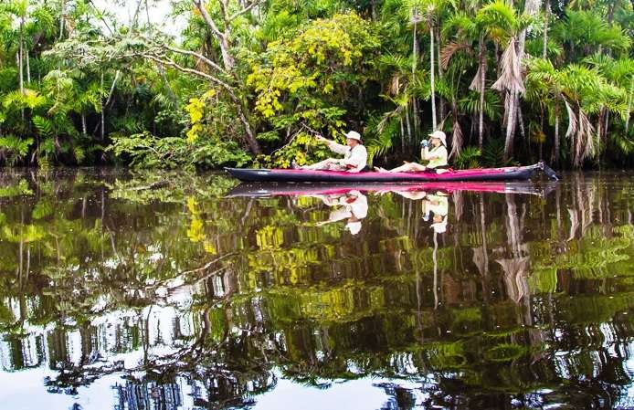 - Pañacocha Lake and Pañayacu River, where guests paddle through sections of forest that are floating, cross lakes to look for pink freshwater river dolphins, and scan the jungle for over 12 species of primates.