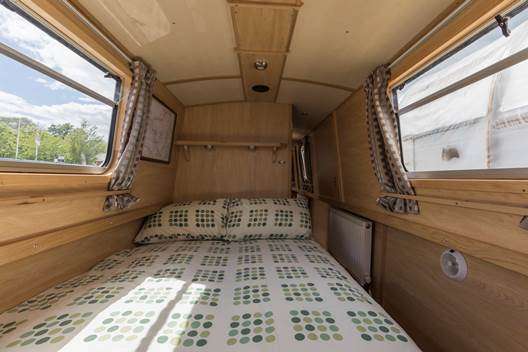 The Grew Wren has its living and fully equipped kitchen area in the bow, with the shower/toilet mid-boat and a double bunk at the stern.
