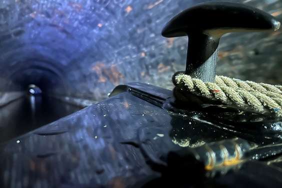 It consists of two large caissons, or watertight containers, which move up and down, allowing boats to be lifted or lowered some 50feet between the canal and river.