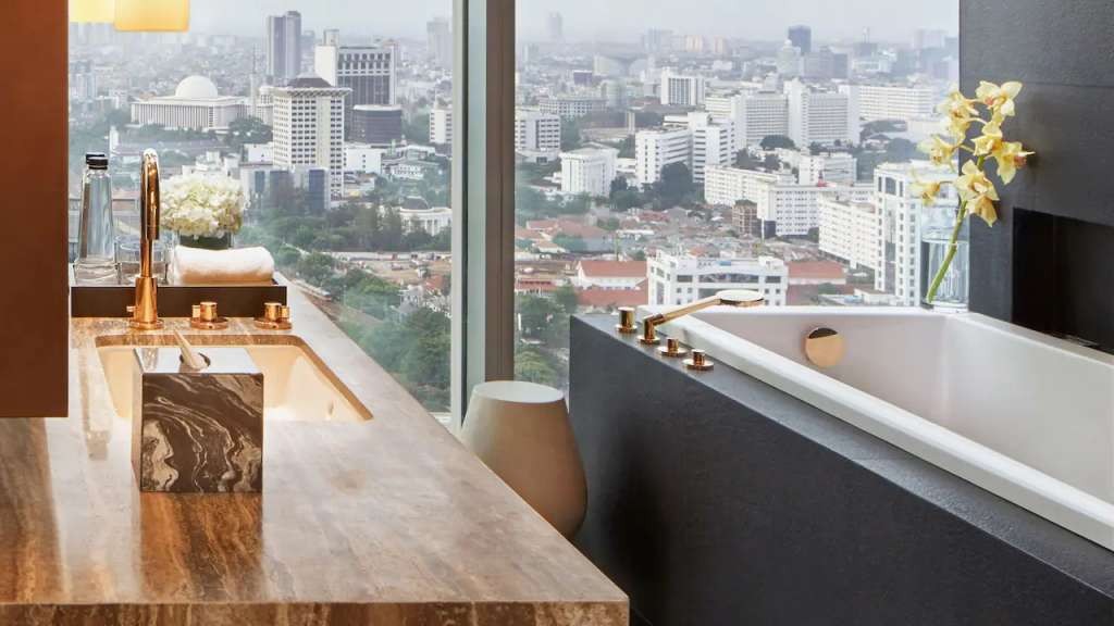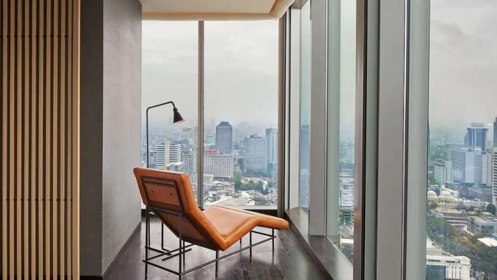 The hotel occupies the top 17 floors of the 37-storey Park Tower in the centre of the city's financial and diplomatic district. The Menteng area was originally conceived in the early 20th century as a garden city and is now known for its peaceful tree-lined streets, abundant greenery and elegant heritage architecture.