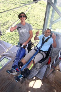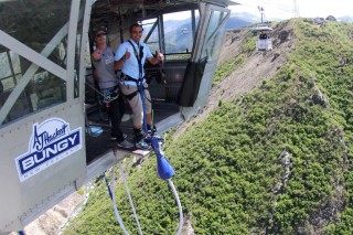 After registration has taken place at the AJ Hackett headquarters in the centre of Queenstown, it is time to board the bus as you begin your pulsating climb to the plunge. On arrival at the Bungy site, many participants were displaying their pre-jump nerves by struggling to get themselves into their jump suit to the extent that it drew comparisons with Inspector Clouseau's mannerisms from the Pink Panther movies. Thereafter it was time to take the short cable car ride with my group to the jumping platform. Whilst I was getting strapped up by my instructor, he informed me that he was still feeling 'high' from his excursions the previous night. Given that I had a feeling of 'the next victim' as I came closer to the dropping platform, his comments led to immediate concern in my mind as my safety (life) was in his hands. However just moments later I suddenly switched on again and noted his 'dark humour'. Indeed I grinned back at him and started to feel at ease somewhat.
