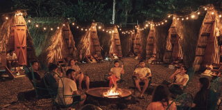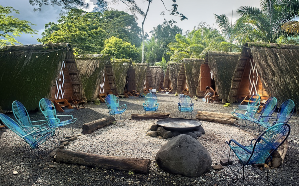 Rooms here are hidden out of view of the main areas, which boast a swimming pool, large bar/restaurant area with space to lounge, an open-air kitchen for self-caterers, a yoga deck, and then a space in the jungle where there are a series of glamping teepees that surround a fire pit.