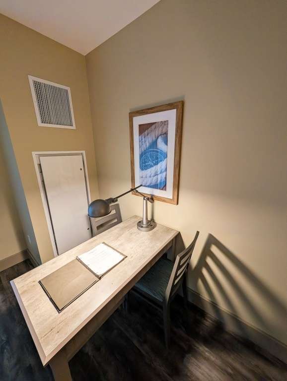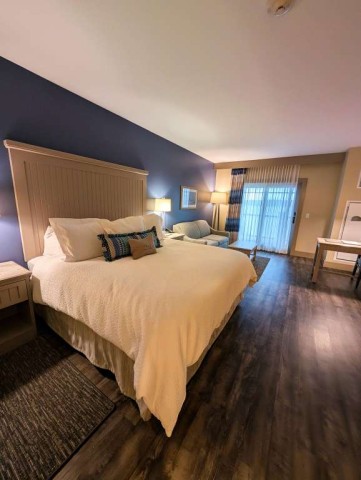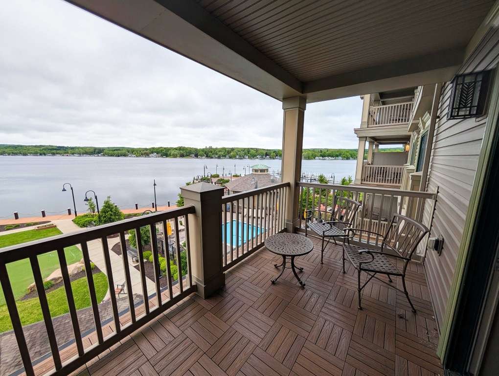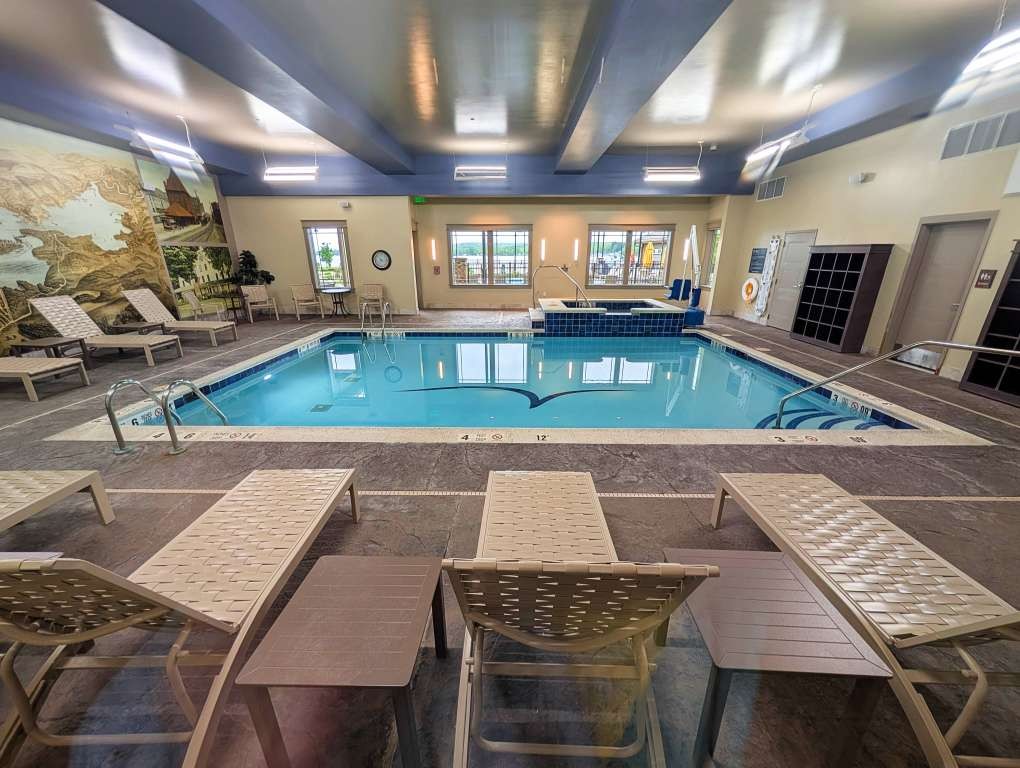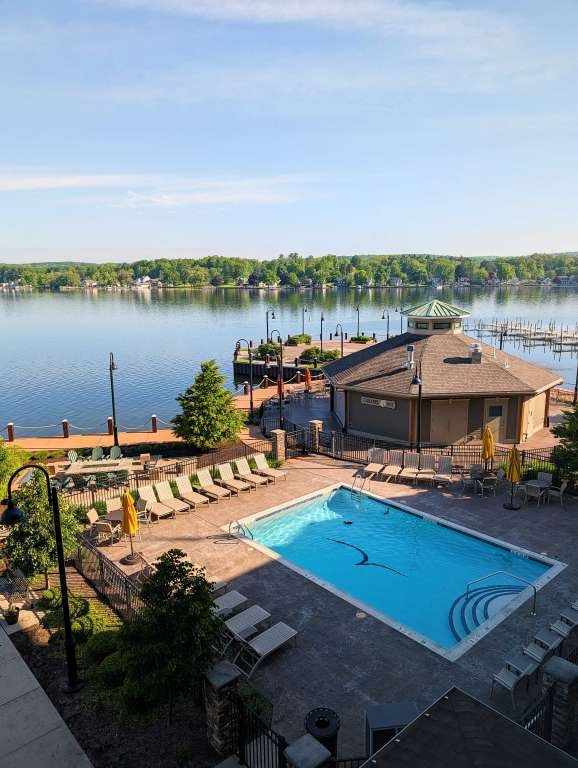 The rooms at the Chautauqua Harbor Hotel feel less like accommodations and more like a quiet continuation of the lake itself. Pale woods, soft blues, and maritime details echo the water just beyond the windows. Floor-to-ceiling sliding doors frame Lake Chautauqua like a living postcard. The beds invite lingering. Bathrooms are polished but practical. But the best part of the room is the private balcony; we stayed in room 338, which gave us a great view of both the lake and the outside bar and pool area. The pool is both recreational and reflective, inviting play and relaxation.
