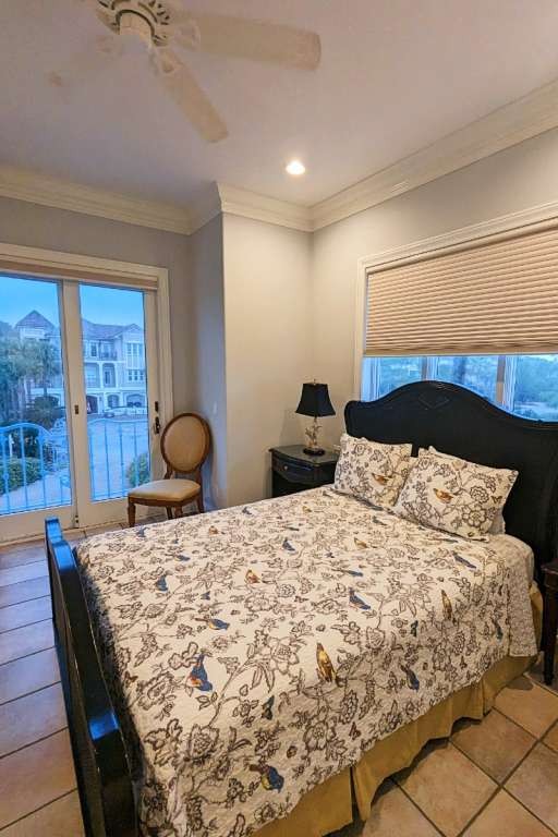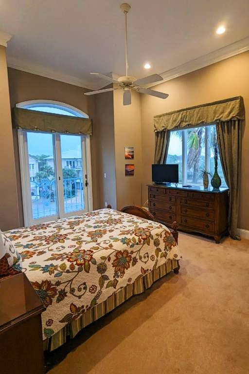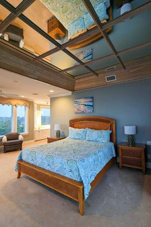 Having the entire house to myself, I chose to occupy the master suite, featuring a king bed with wrapping views of the Gulf of Mexico. The bedroom has a large, private balcony. Inside, there is a sitting area and desk near the gold accented bathroom with double vanity, large soaking tub, and walk-in shower big enough for two. I spotted some speakers, but I never took the time to get the music playing. The suite has plenty of drawer space and a walk-in closet.