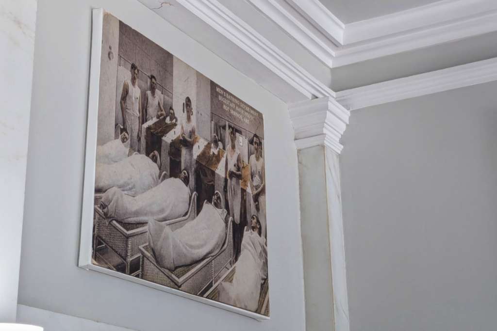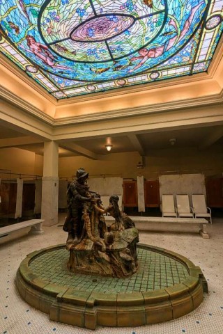 After securing belongings in a locker—with locker rooms designated male and female—and wrapping up in a modesty-preserving sheet, a personal bath attendant leads guests to a deep tub (long and deep enough for my 6-foot-plus frame). An optional loofah scrub precedes a swirling, 100-degree mineral water soak for the next 20 minutes. The journey continues through a circuit of classic treatments: a hot towel wrap, a sitz bath, a the most interesting part of the visit, the steam cabinet, where guests are jacketed in stainless steel except for the head. Visitors can opt to add a 20-minute massage to the wellness plan.
