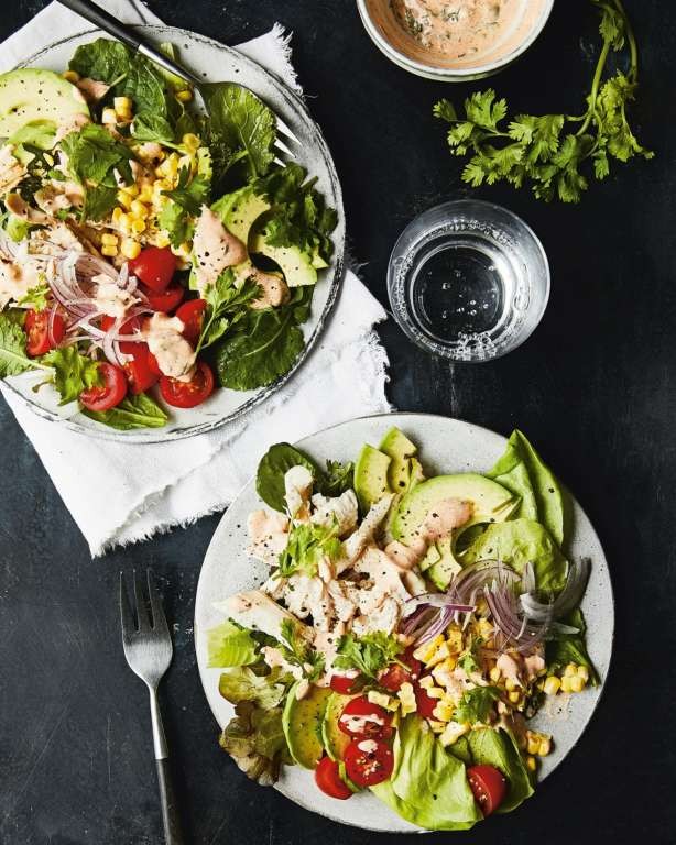 Make the salad: Divide the baby greens, chicken, tomatoes, corn, red onion, and avocado among 4 plates. Drizzle each with 21⁄2 tablespoons aioli, garnish with cilantro, and serve.