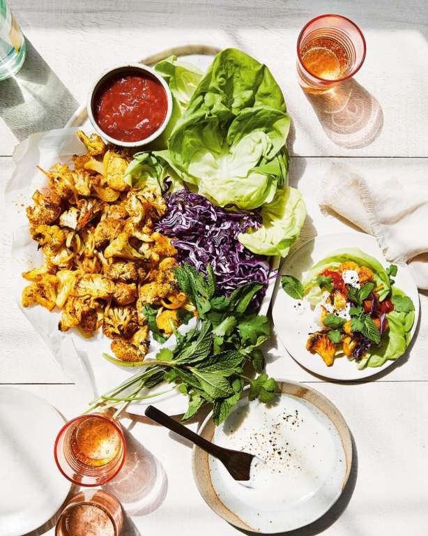 SERVE NOW: Fill each lettuce leaf with 1⁄4 cup cauliflower, then drizzle each with 1 generous tablespoon white sauce. Top with 1 teaspoon harissa and garnish with sliced red cabbage, cilantro, and mint leaves.