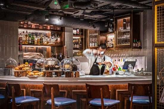 Decorated in blues and greys it is a cross between plush and warehouse, casual and formal, with its padded seats, exposed pipework, subtle lighting, bare marble top tables, linen napkins and silver cutlery.