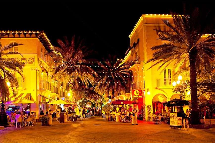 Conceived as the recreation of the romantic Mediterranean villages of Spain and France, it offers sidewalk restaurants shaded by awnings.
