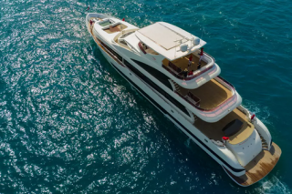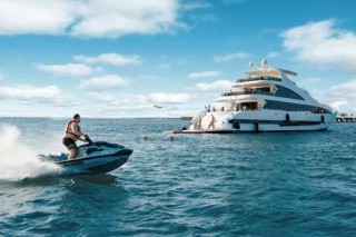 This four-storey, 42-metre-long floating beauty is all gleaming white fibreglass, polished teak, glittering chrome and cushy sectional couches.