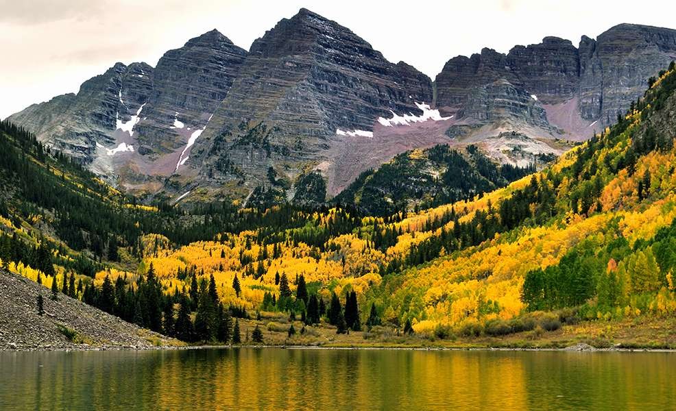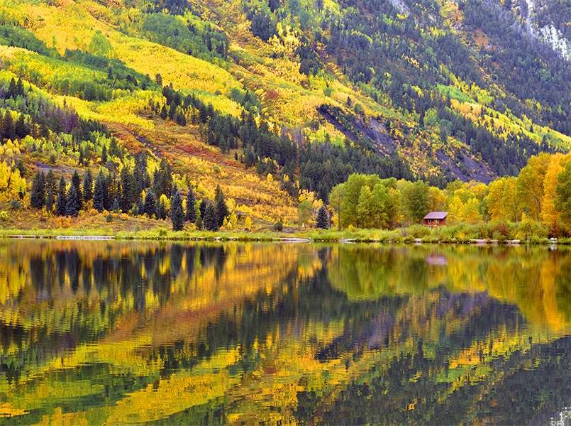 Marble from this area was used in the Lincoln Memorial and the Tomb of the Unknown Soldier in Washington D.C.I was interested in visiting the old Crystal Mill but the four wheel drive road to get there was impassable. I received an unexpected bonus as we passed the serene waters of Beaver Lake. The calm waters reflected the colorful yellow and green hillsides above