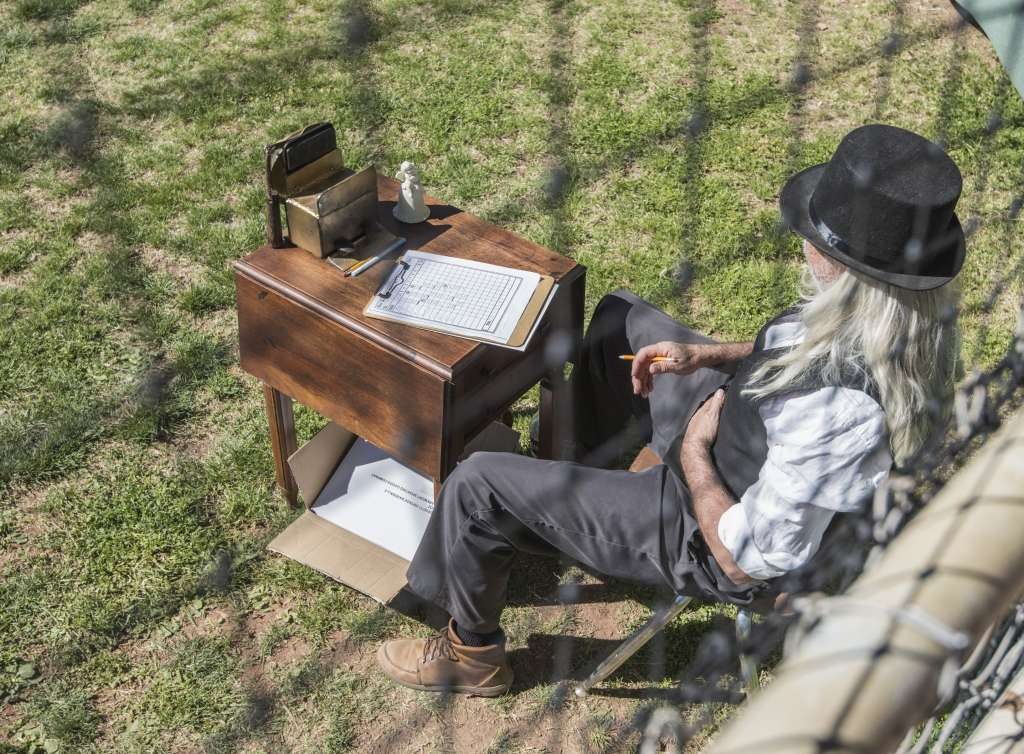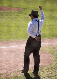 The Phoenix Senators took the field against the Tucson Saguaros in the early afternoon of the first day. The players are dressed in period uniforms that seem it fit the style of play on the field.Runs are scarce since outs are easier to get and the ball does not travel near as far.The innings roll by and I was fascinated when the first run was scored. The scoring player goes up to a small desk against the dugout.Here the official scorer sits with his clipboard and a brass bell.The player rings the bell after crossing home plate and the run is officially registered.Can you imagine that in the Major Leagues of today?