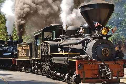 The Yosemite Mountain Sugar Pine Railroad vintage train is located five miles from the South Entrance along Highway 41 offering tours including the Moonlight Special and the Yosemite Jazz Train.