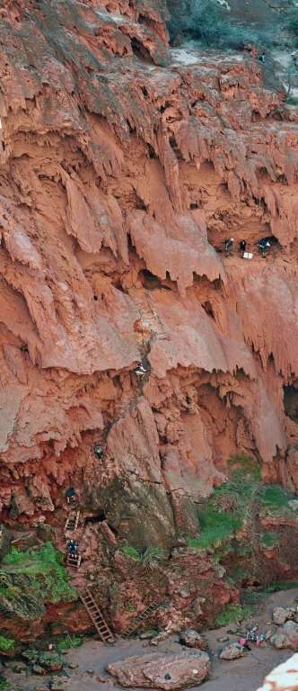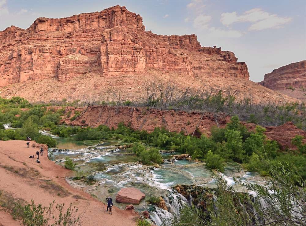 Before the sun rose the next morning we were up and strapping on our backpacks for our hike and descent to Mooney Falls. Mooney is the highest waterfall of Havasupai with a 200 ft drop from rim to pool. It is about a mile downstream from Havasu Falls as the river flows steadily downhill as its proceeds west to join the mighty Colorado several miles away. The hike was easy but the climb down the steep cliff side thru caves, steps carved out of rock, and clinging on to chains as your body hangs over sheer drops was stimulating to say the least. While a little scary no one has fallen off. Our oldest member was 80 years old and makes the descent and the ascent without incident. The fall roared at us as we reached the bottom.The power of water made the ground shake as we set up our tripods to capture its portrait.
