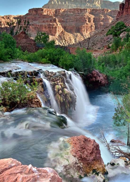 The view of Navajo Falls spilling over the travertine shelf with the red canyon mesas being lit up by the morning sun caught my attention. The light of the rising sun made the canyon walls stand out as the sky turned blue and the water sparkled. I spent several hours wandering the river looking for that perfect spot.