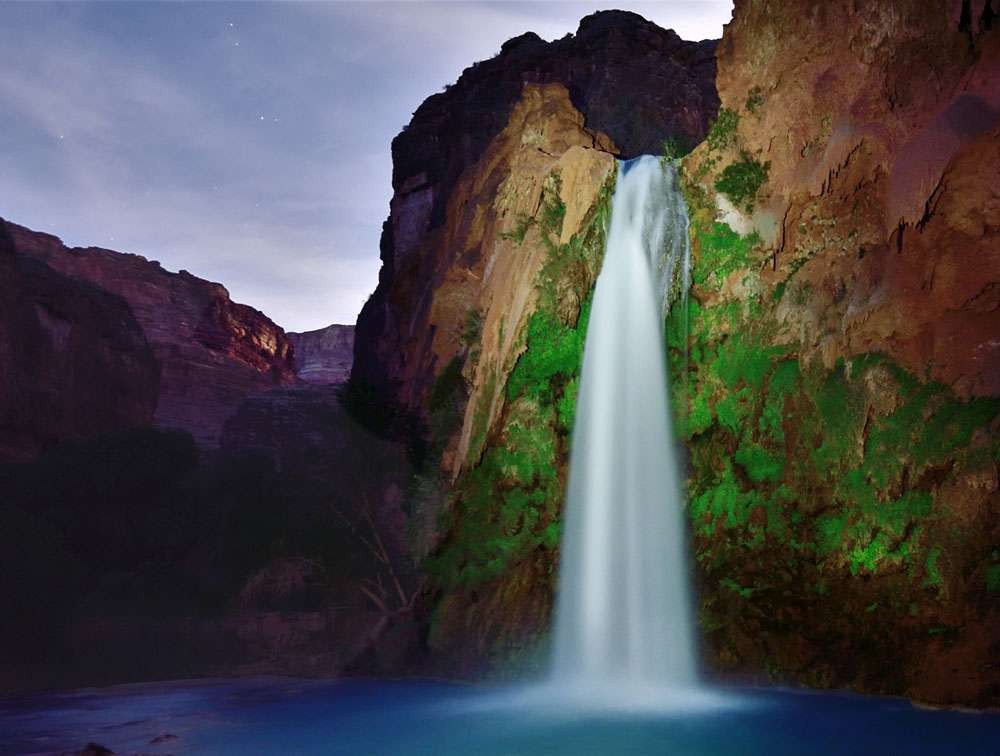 Evening brought our first excursion to the falls. We were on a photography tour so beautiful images were our goal. We set up along the shore at the bottom of Havasu falls and waited for nautical twilight. As darkness descended we began lighting the falls with flashlights and triggering our shutters to capture the surreal image of a waterfall at night.