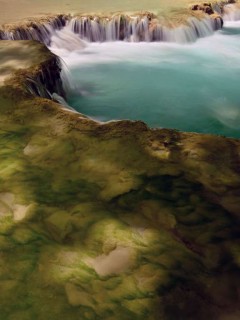 We explored down stream stopping at the many travertine pools that act like small steps as the river descends on its path west. Travertine is the result of mineral deposits slowing forming into rock. The blue green color of the waters comes from the high concentration of Calcium Carbonate and other minerals that are leached out of the canyon walls by the summer storms.