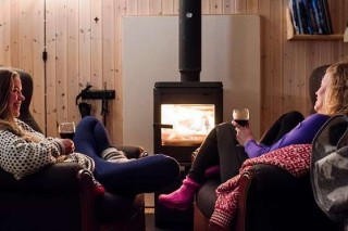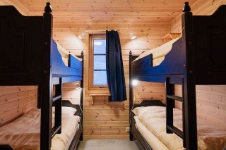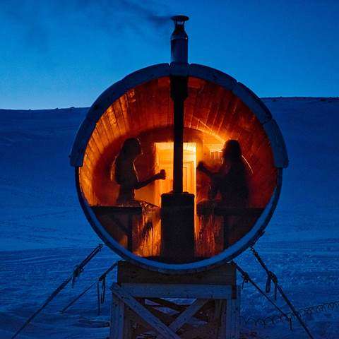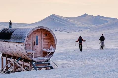 The cabin, which offers views of Svalbard's wild, pristine scenery, is equipped with cushy beds, a fireplace, a Scandinavian-styled lounge room, kitchen, and a barrel-shaped standalone wood sauna.