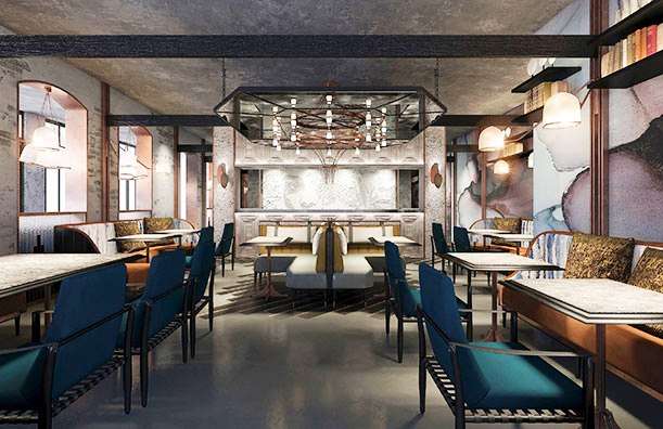 It has an imposing redbrick façade while inside a revamp of the original space sees restored columns, soaring ceilings, and wrought-iron marquees sitting side-by-side with original frescos painted by Adrian Karbowsky in 1910, mosaic tiled flooring, and tall arched windows.