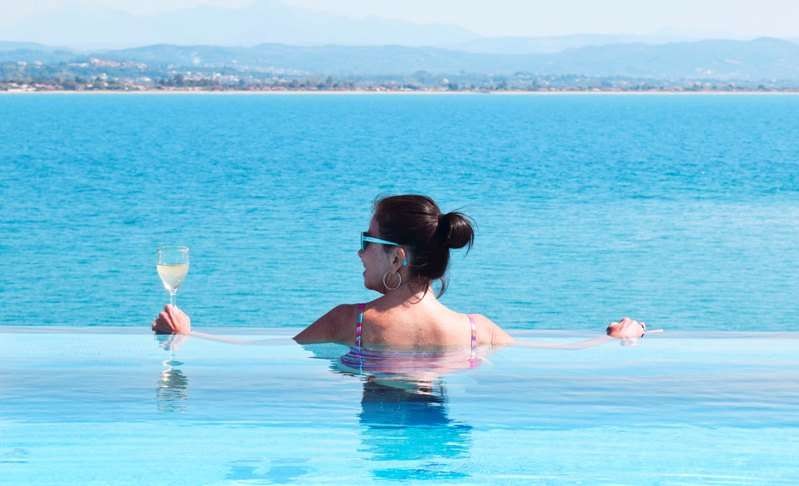 The clear pool water, delightfully and deceitfully, melds seamlessly with the azure of the Mediterranean Sea and the blue of the sky on the horizon.