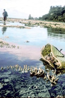 At night the air was filled with strains of a cappella voices from the church building carried across a silent lagoon. A blue glow coming out of almost every primitive home was a unique sight. The villagers watched television almost religiously every night. Being too remote for broadcast or cable, the residents rely on renting video cassettes.