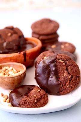 1. In a mixer on medium speed, cream butter and sugars together for 3 minutes or until mixture looks light and fluffy. Add egg and vanilla. Mix until fully combined. 2. In a separate bowl whisk together flour, cocoa powder, ground cinnamon, and baking soda. Add dry ingredients to wet ingredients and mix on medium until dough comes together. 3. Mix in pine nuts until just combined.