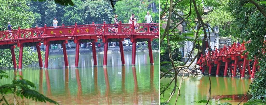The Huc Bridge was built in 1865 during the reign of King Tu Duc with the aim of connecting Ngoc Son Temple to the shore. No one seems to know how the crossing was made before the bridge was built, but I assume it was by boat.