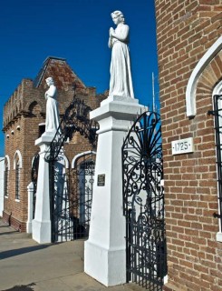 The cemetery at St. Roch is unusual in that all the graves are above ground due to the shallow water table. You walk thru a metal gate guard by two white angels to walk among rows of marble and stone shrines of this city of the dead. The Chapel is the centerpiece of the cemetery that is dedicated to St. Roch, who was credited with saving this neighborhood from a yellow fever epidemic in the 19th century. he chapel has a room filled with prosthetics from worshippers who claim to have been cured of their disabilities by the saint of dogs and good health.