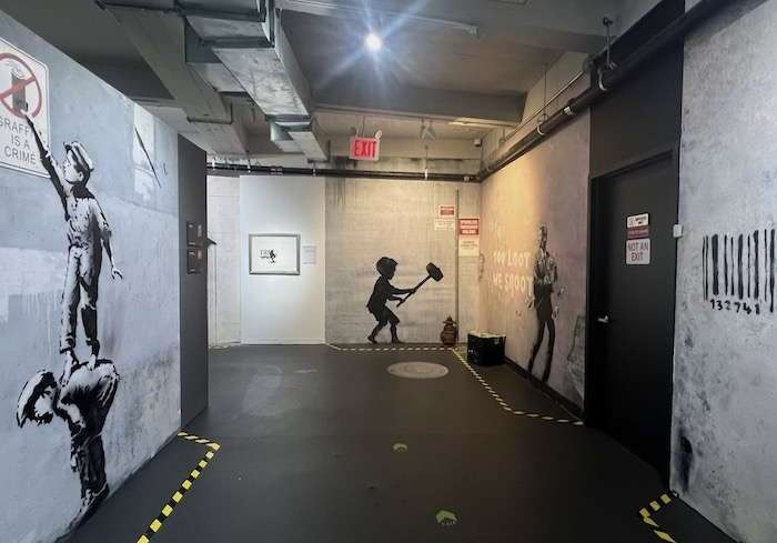 You may have seen Banksy work in situ before. You may have seen collections of Banksy or even visited his Walled Off Hotel in Paris.Here though, in the New York Banksy Museum you see a retrospective of sorts.The graffiti murals that are Banksy's stock in trade are displayed in such a way that none compete with the others. You feel like you are walking a maze of alleys all with the Banksy imprimatur.We saturate in Banksy irreverence.We linger with the detailing in the re-created Walled Off Hotel guest room—- thinking of the heavy US bombs now being deployed in Gaza and paid for with US tax dollars.
