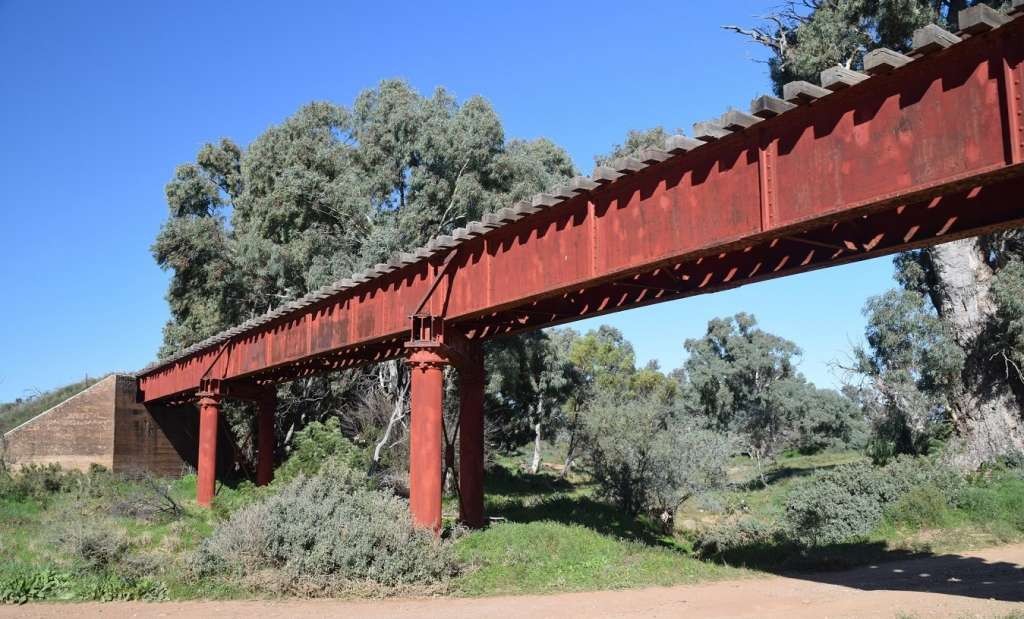 The red bridge is the remnants of a railway that opened in the late 19th century and went from Carrieton to Peterborough via Orroroo. The bridge is all that remains of the line.