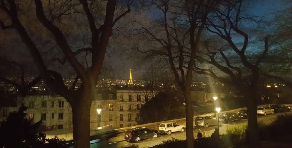 Before the sun sets on the city, I like to hop on the metro and travel to Anvers Station where I alight in the proximity of the Sacre-Coeur. There's a 5 minute walk through streets and souvenir stands before you reach the foot of the large grassy expanse of the Square Willette. This is the foot of the hill on which the Sacre-Coeur stands. There is a funicular railway which can take you to the top of the hill but I prefer to walk up the paths and steps. With an Irish Pub close to the top of the hill and normally some open air music going on at the top, there's a lot of entertainment going on before you get to the Sacre-Coeur. On reaching the top, if you turn round and look back down the hill, one of the best views of Paris you can imagine is spread out before you. To catch this view at it's very best, turn right and walk along the Rue St Eleuthere. Among the trees which surround you, you will be able to see the Eiffel Tower in the distance. Seeing the Eiffel Tower at sunset or lighting up the night sky from this viewpoint is one of my favourite views of Paris.