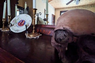 The house has a full kitchen, complete with a fava beans poster. Throughout the house the décor is all Silence of the Lambs themed, and it is amazingly tasteful. Each room is decorated with unique items—from mantel decorations to original artwork—and stuffed Precious dogs are sitting throughout the house.